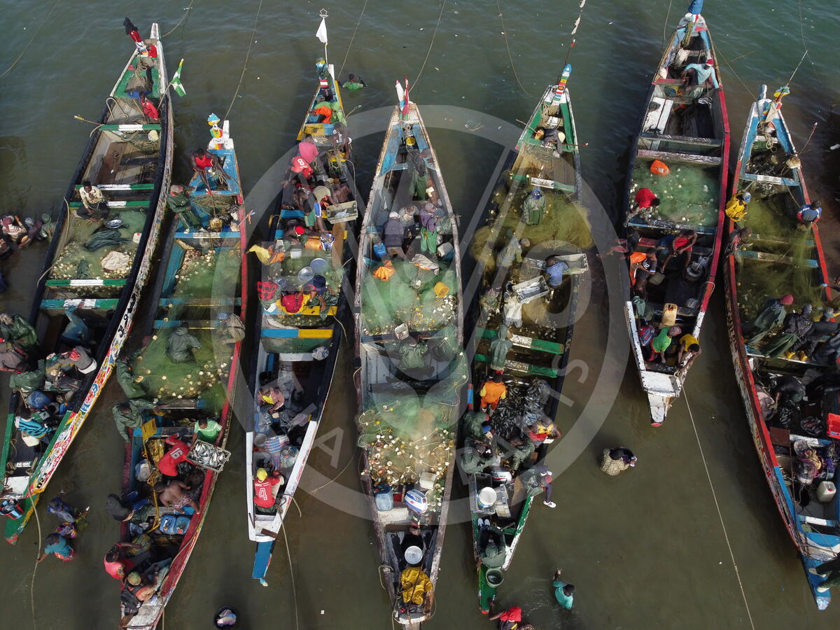 GAMBIA, 2023. Aerial view of boats at Tanji port