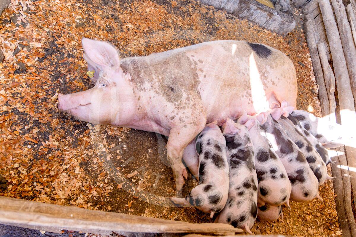 12 June 2025. Rutsiro District, Rwanda. Sow and piglets in a pigsty on a smallholder farm. FAO in Rwanda has been supporting small-scale livestock farmers through their Farmer Field Schools.