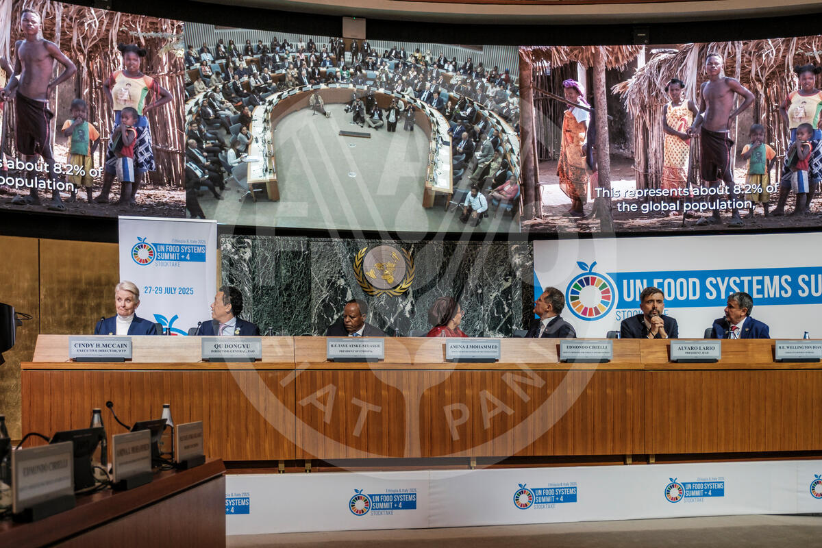 28 July 2025, Addis Ababa, Ethiopia. From L to R: Executive Director of the United Nations World Food Programme (WFP), Cindy McCain, FAO Director-General, QU Dongyu, the President of Ethiopia, Taye Atske Selassie, United Nations Deputy Secretary-General, Amina J. Mohammed, the Italian Deputy Minister of Foreign Affairs, Edmondo Cirielli, the Director of the International Fund for Agricultural Development (IFAD), Álvaro Lario, and the Minister for Development and Social Assistance of Brazil, Wellington Dias participate in a panel during the High-Level Launch of the State of Food Security and Nutrition in the World 2025 (SOFI 2025).