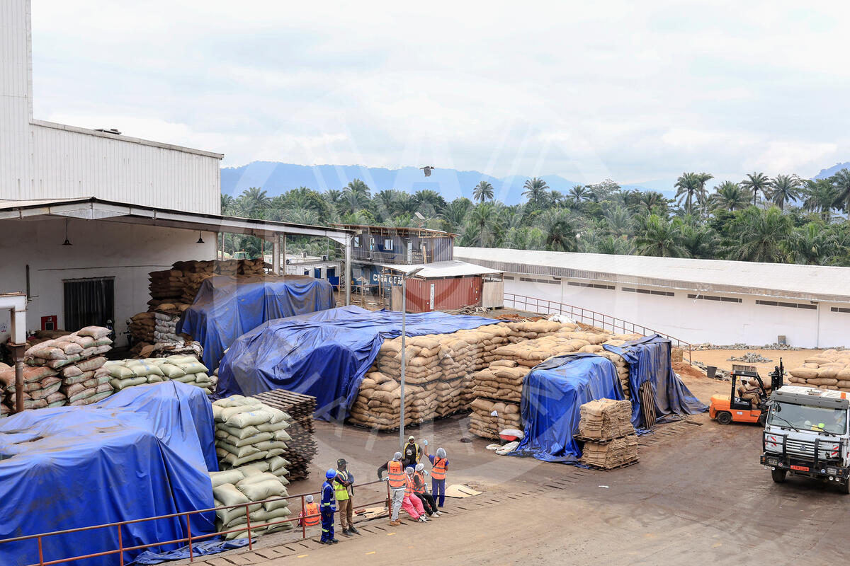 21 August 2025. NEO Industry SA, Kekem. Aerial view of the factory showing stacked cocoa bags and a truck.