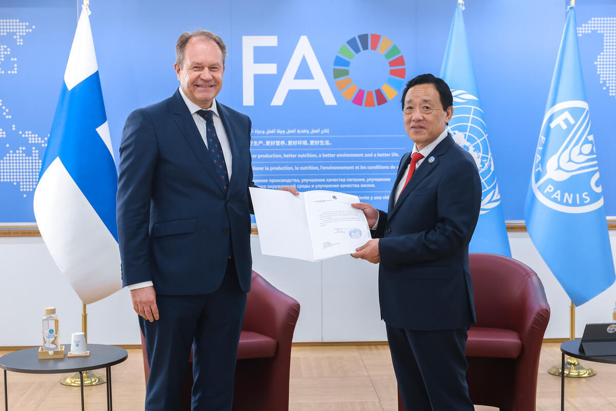 29 September 2025, Rome, Italy. Finland Minister Counsellor Pasi Pöysäri (L), presenting his credentials to FAO Director-General QU Dongyu (R). FAO headquarters (Iraq Room).