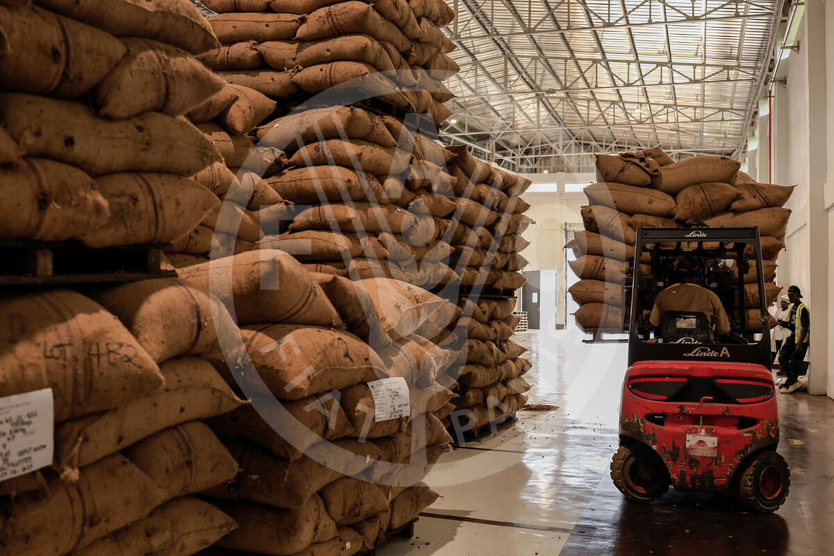 21 August 2025. NEO Industry SA, Kekem. Stacked cocoa bean sacks in the factory.