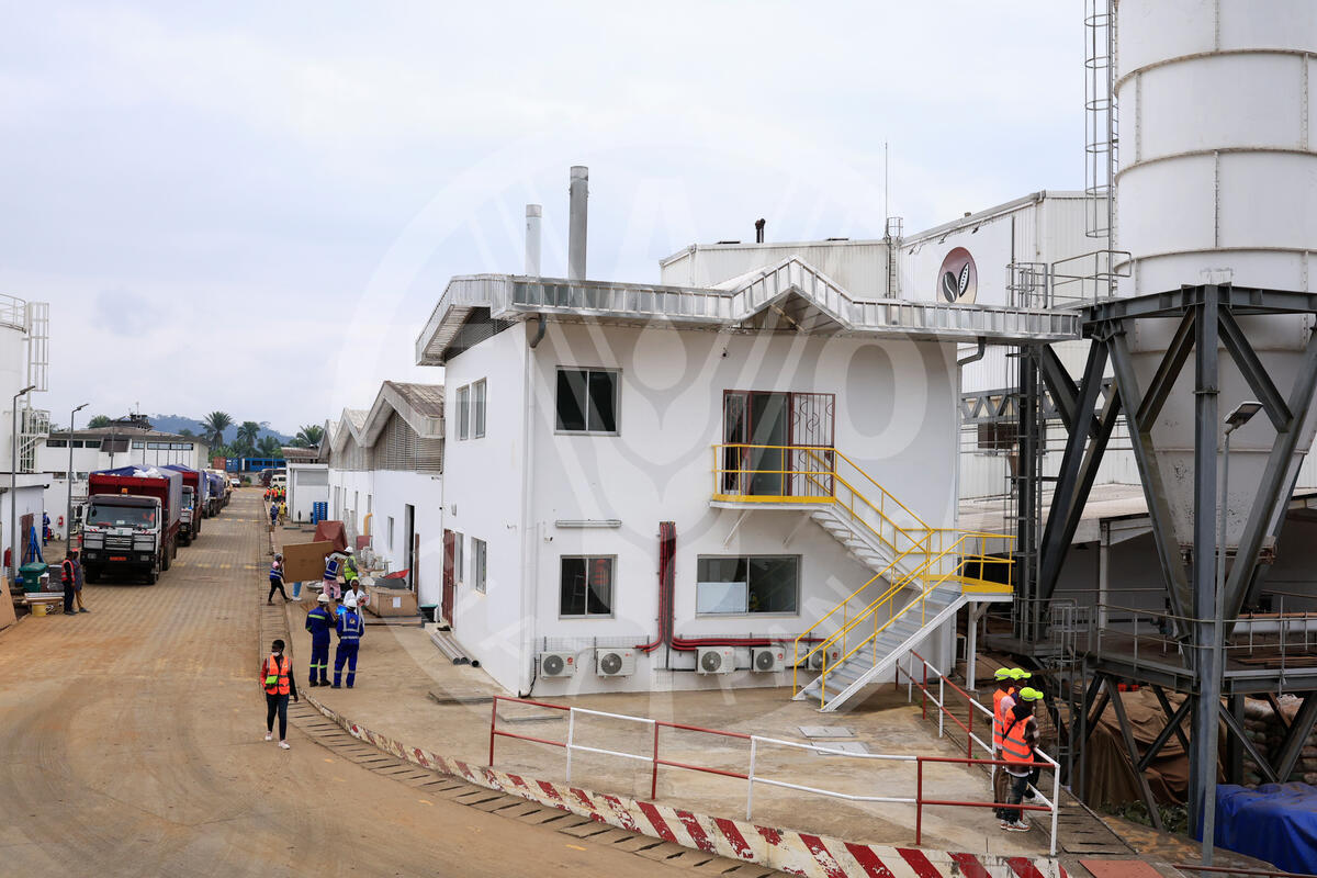 21 August 2025. NEO Industry SA, Kekem. Overhead view of the factory, showing the offices and cocoa storage silo.