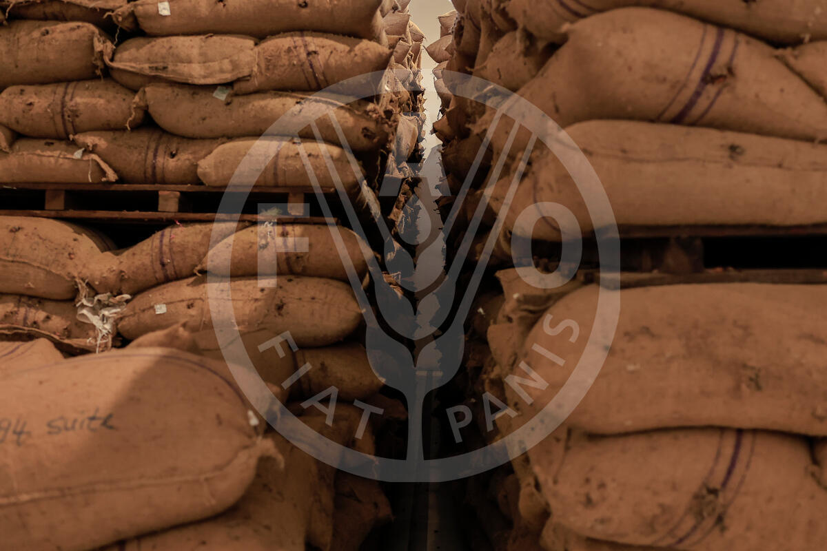 21 August 2025. NEO Industry SA, Kekem. Close-up of cocoa bean bags being unloaded from a shipping container.