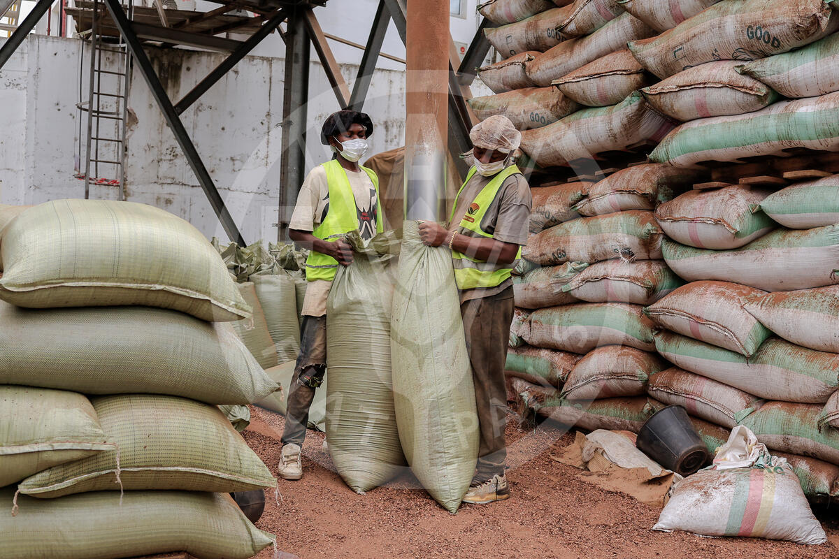 21 August 2025. NEO Industry SA, Kekem. Two workers filling cocoa by-product into bags using a pipe.
