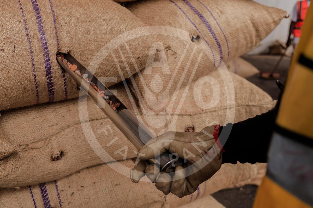 21 August 2025. NEO Industry SA, Kekem. Close-up of the extraction of cocoa beans from the bags.