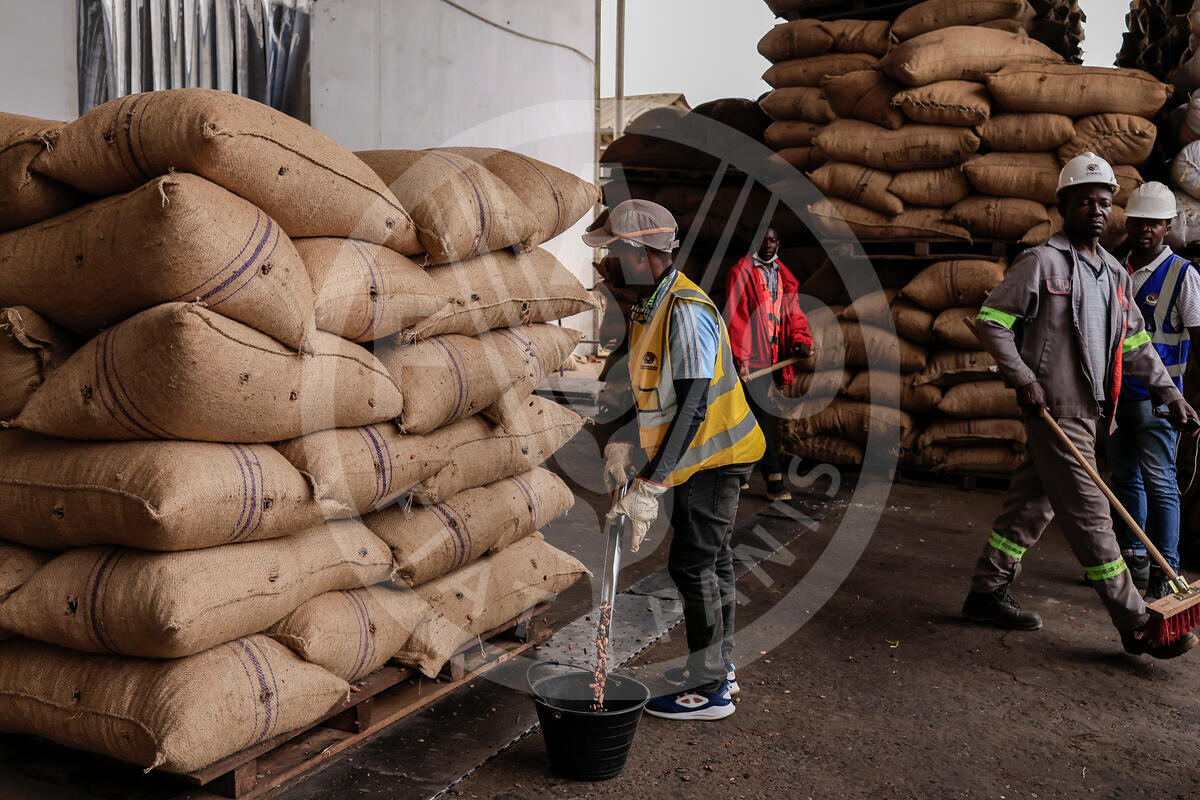 21 August 2025. NEO Industry SA, Kekem. Workers with a hose pouring cocoa beans next to a stacked pile of cocoa bean bags.