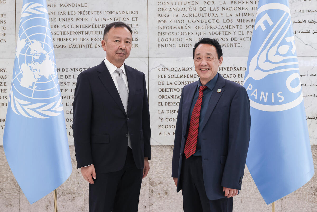 30 September 2025, Rome, Italy. FAO Director-General QU Dongyu (R) and China Vice Governor of Hainan Province, Bateer (L) pose in front of the FAO Constitution following their bilateral meeting.