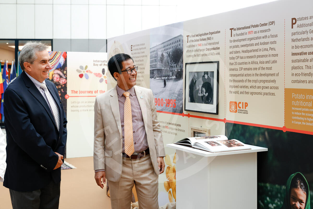 26 May 2025. Rome, Italy. Yurdi Yasmi (R), Director of the Plant Production and Protection Division, FAO, José Eduardo González Mantilla (L), Deputy Permanent Representative of Peru, Permanent Mission of Peru to the International Organizations based in Rome visit the exhibition on the occasion of "International Day of Potato", set up at the FAO Atrium. FAO Headquarters.