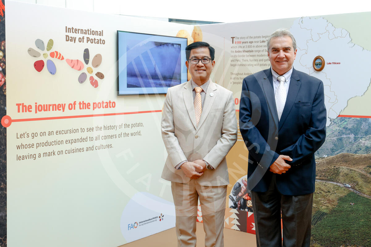 26 May 2025. Rome, Italy. Yurdi Yasmi (L), Director of FAO's Plant Production and Protection Division, and José Eduardo González Mantilla (R), Deputy Permanent Representative of Peru, Permanent Mission of Peru to the International Organizations based in Rome, inaugurate the exhibition on the occasion of "International Day of Potato" set up at the FAO Atrium. FAO Headquarters.