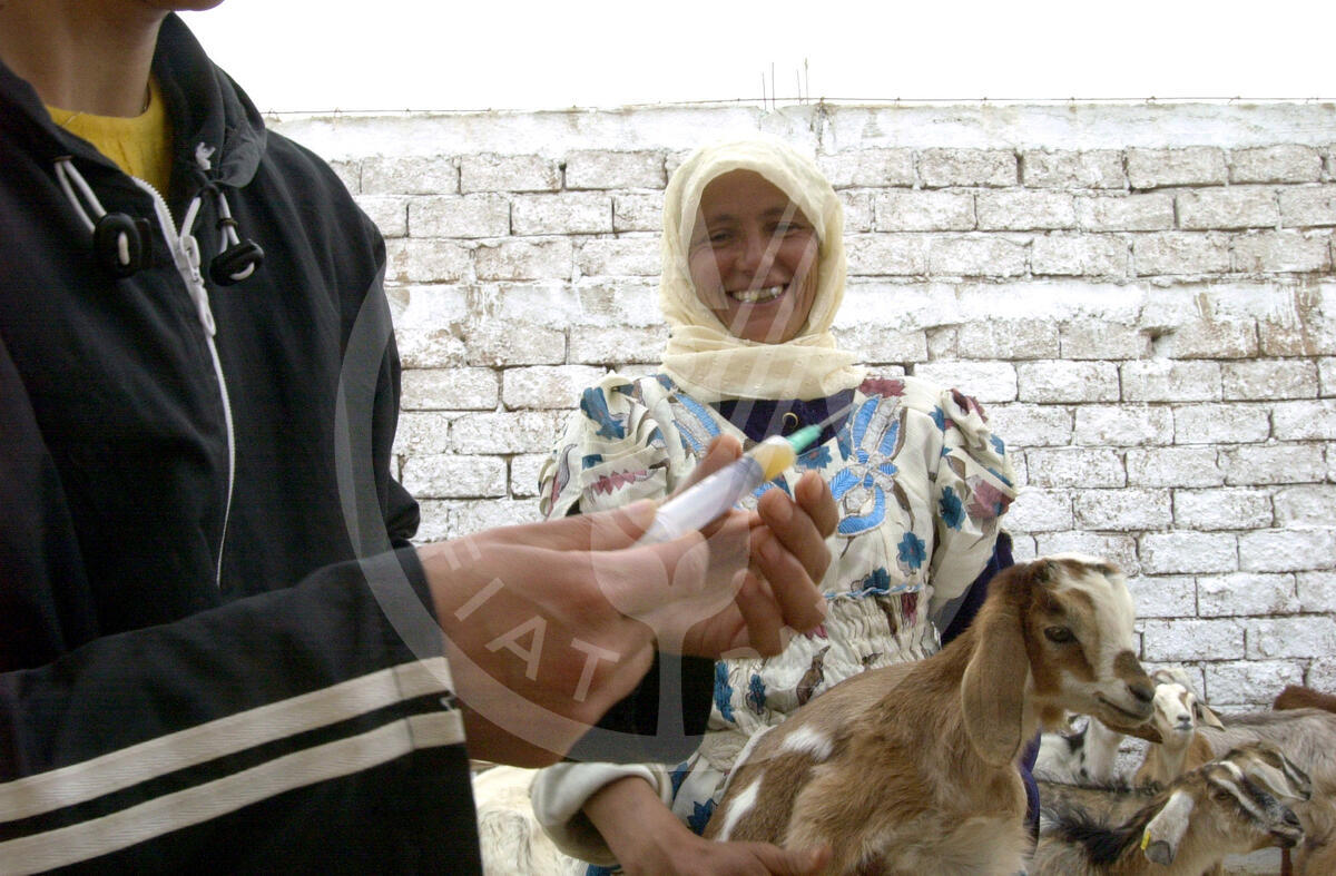 The President of the Tissaf Women's Cooperative, who is a University biology student, giving a goat a vaccination.