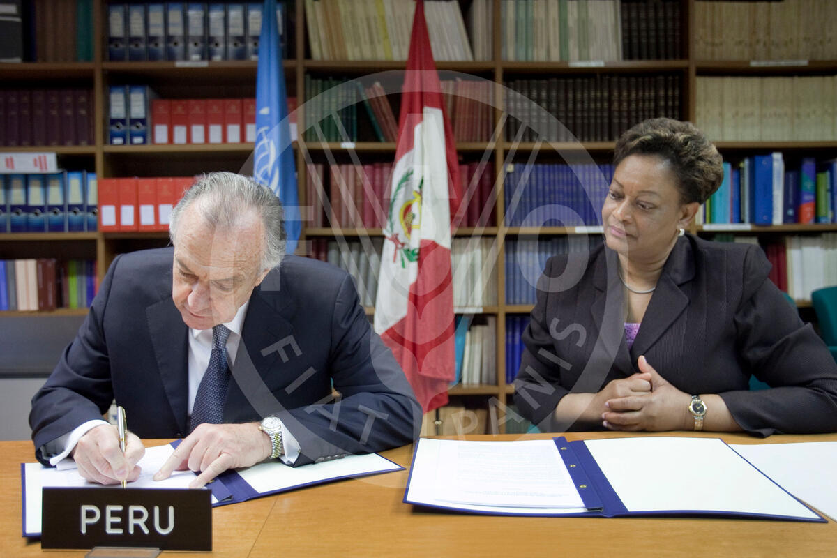03 March 2010, Rome - Augusto Ferrero Costa, Ambassador of the Democratic Republic of Peru' (L), flanked by Lorrain Bernadine Williams, signing Ceremony of the Agreement on Port State Measures to Prevent, Deter and Eliminate Illegal, Unreported and Unregulated Fishing.