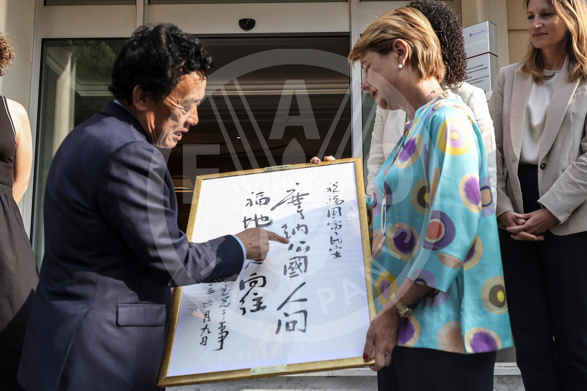 10 June 2025, Montecarlo, Monaco. FAO Director-General QU Dongyu (L) presents a chinese calligraphy as gift to the Minister of Foreign Affairs and Cooperation of Monaco Isabelle Berro-Amadeï (R).