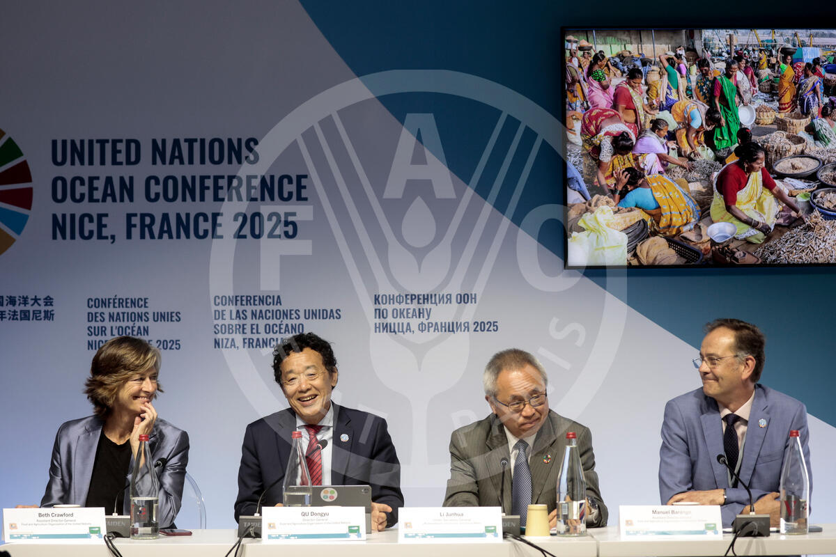 11 June 2025, Nice, France. (Left to Right) FAO ADG Beth Crawford, FAO Director-General QU Dongyu, Li-Junhua Under-Secretary-General for Economic and Social Affairs Department of Economic and Social Affairs and FAO ADG Manuel Barange. FAO High-level event: Achieving SDG 14.4 for a sustainable future, Updated sustainability status of the World’s marine fishery resources. United Nations Ocean Conference 2025.