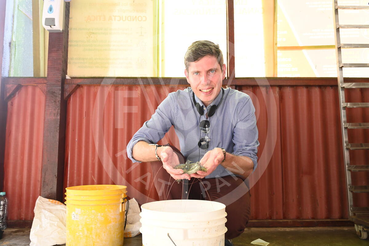 28 Feb 2025, Tumbes, Peru. Dimitar Taskov, FAO Aquaculture Specialist, holding whiteleg shrimp at Domingo Rodas Shrimp Farm – Marinasol, Tumbes, Peru.