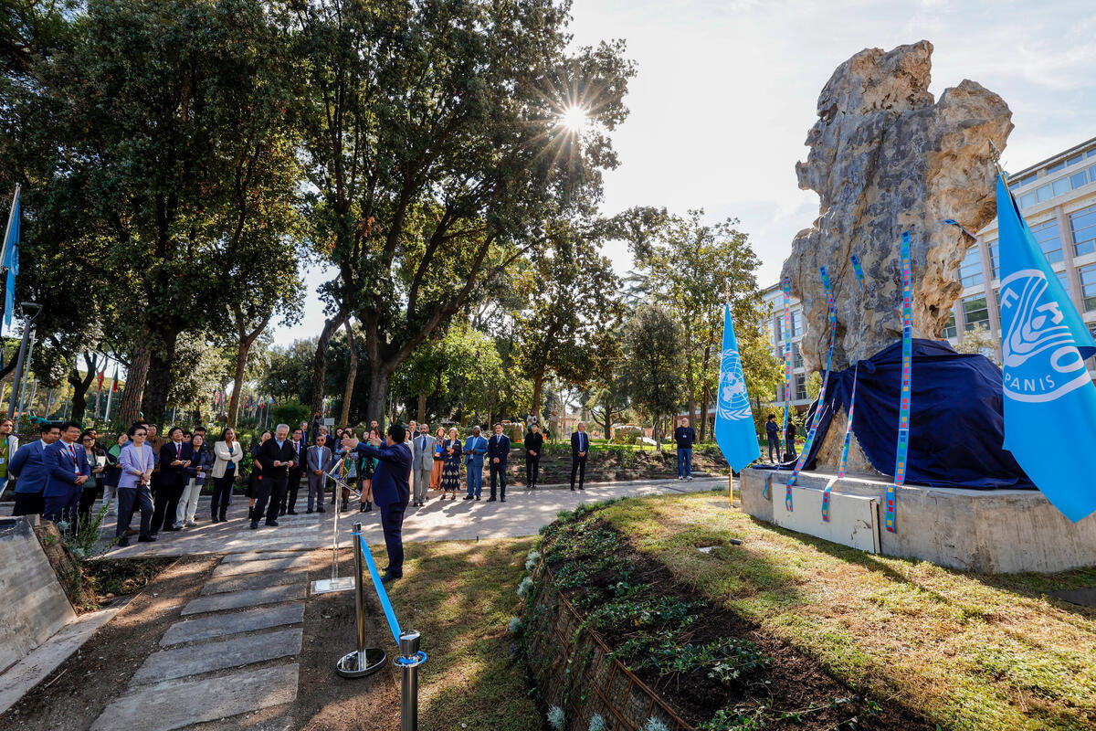 09 October 2025, Rome, Italy. FAO Director-General QU Dongyu (R) delivers his speech before the unveiling of the Chrysanthemum Stone from China’s Hunan Province. FAO headquarters, (FAO park).