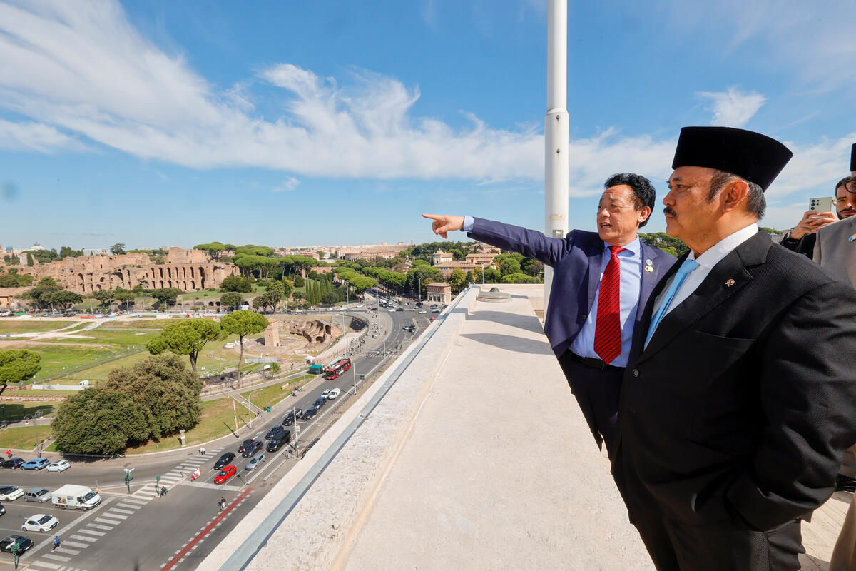10 October 2025, Rome, Italy. FAO Director-General QU Dongyu escorts Indonesia Minister for National Development Planning/Chairman of BAPPENAS Rachmat Pambud to the FAO terrace. FAO headquarters, (FAO terrace Room).