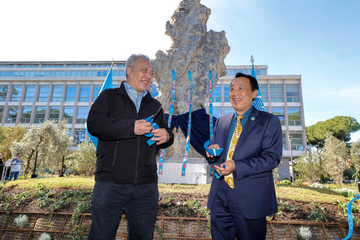 09 October 2025, Rome, Italy. FAO Director-General QU Dongyu (R) and BGI Director of the Board/MGI President Duncan Yu smile after cutting the ribbon during the unveiling of the Chrysanthemum Stone from China’s Hunan Province. FAO headquarters, (FAO park).