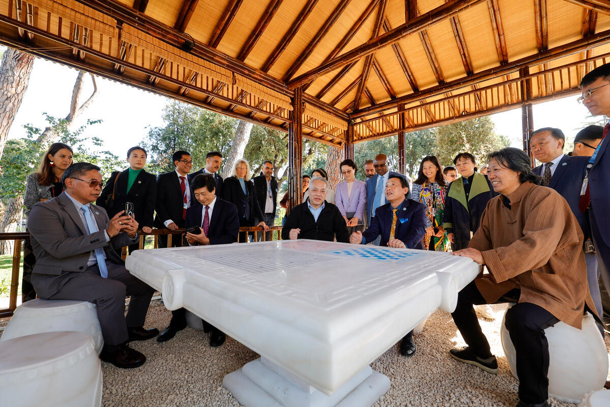 09 October 2025, Rome, Italy. FAO Director-General QU Dongyu (4th from left) and BGI Director of the Board/MGI President Duncan Yu (3rd from left) sit in the new Asian pavilion after the unveiling of the Chrysanthemum Stone from China’s Hunan Province. FAO headquarters, (FAO park).
