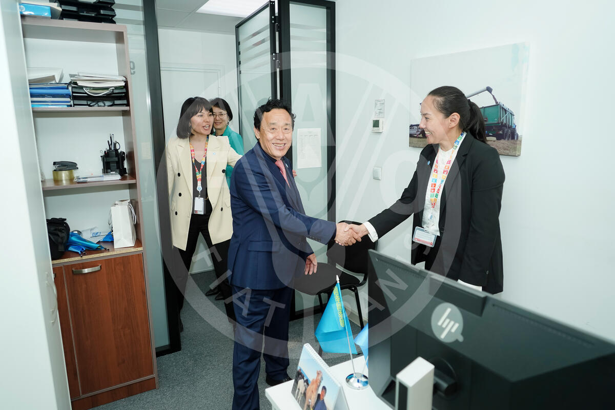 28 May 2025. Astana, Kazakhstan. FAO Director-General QU Dongyu (C) greets FAO staff during his visit to FAO's Partnership and Liaison Office in Kazakhstan.
