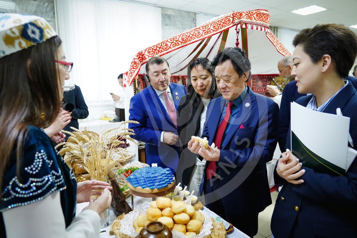 30 May 2025. Astana, Kazakhstan. FAO Director-General QU Dongyu and his delegation listen to presentations of projects by young scientists and startups, including one in the field of potato breeding, in conjunction with World Potato Day, 30 May.
