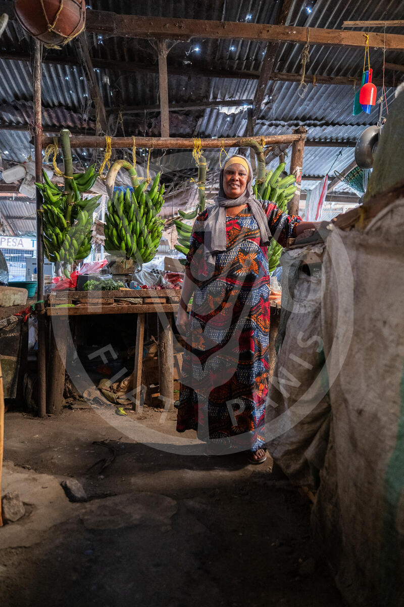 TANZANIA, 2025. Woman stall holder at Fujoni market in Zanzibar