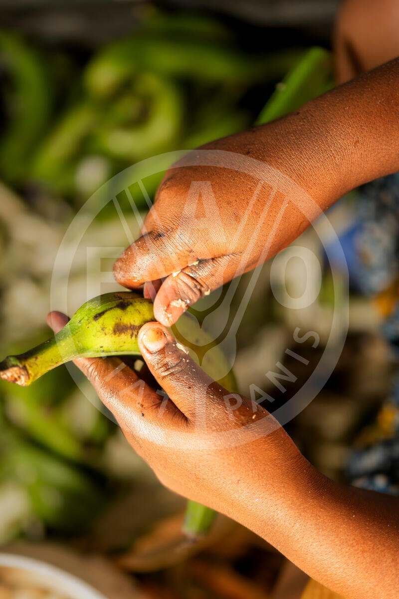 TANZANIA, 2025. Preparing plantain, a staple food in Zanzibar