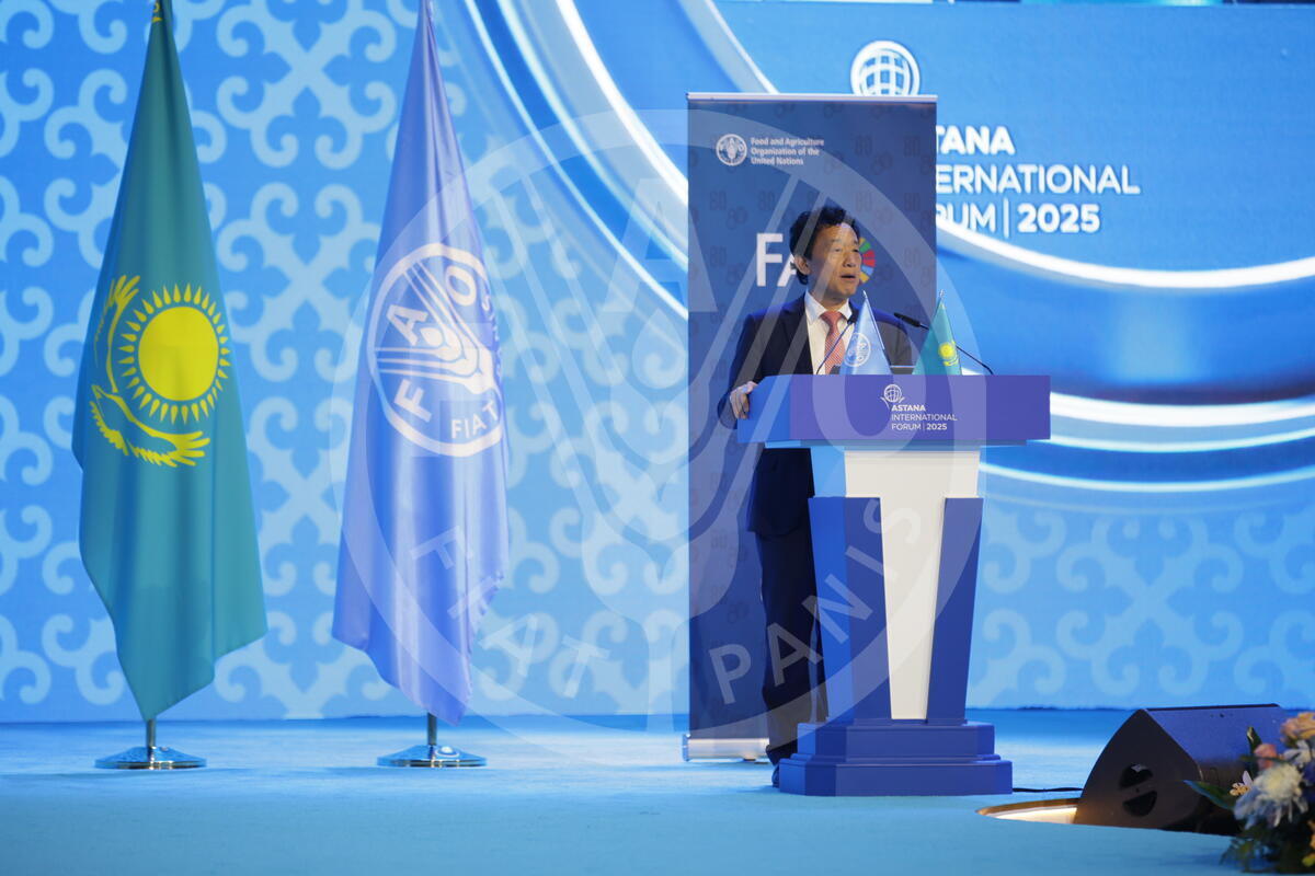 29 May 2025, Astana, Kazakhstan. FAO Director-General QU Dongyu delivers his opening keynote at the FAO Panel Session “Water Security as a Key Investment for Central Asia’s Sustainable Future” during the Astana International Forum