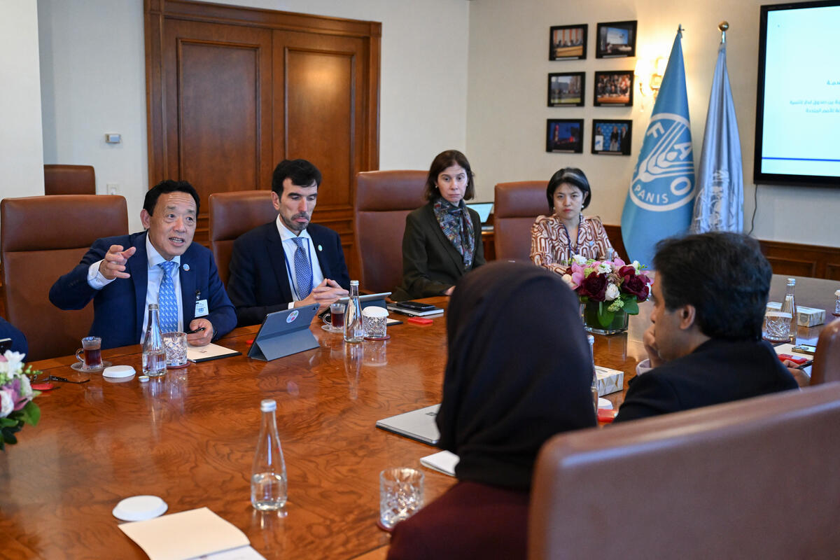 22 September 2025, New York City, USA. FAO Director-General QU Dongyu and his delegation meets Fahad Hamad Hassan Al-Sulaiti (R), Director-General of the Qatar Fund for Development (QFFD).