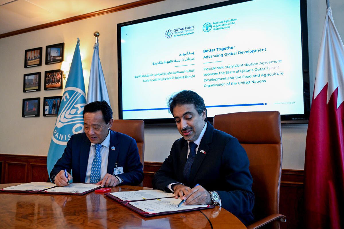 22 September 2025. New York City, USA. FAO Director-General Qu Dongyu (L) and Fahad Hamad Hassan Al-Sulaiti (R), Director-General of the Qatar Fund for Development (QFFD), sign an agreement between the State of Qatar's Qatar Fund for Development and FAO.