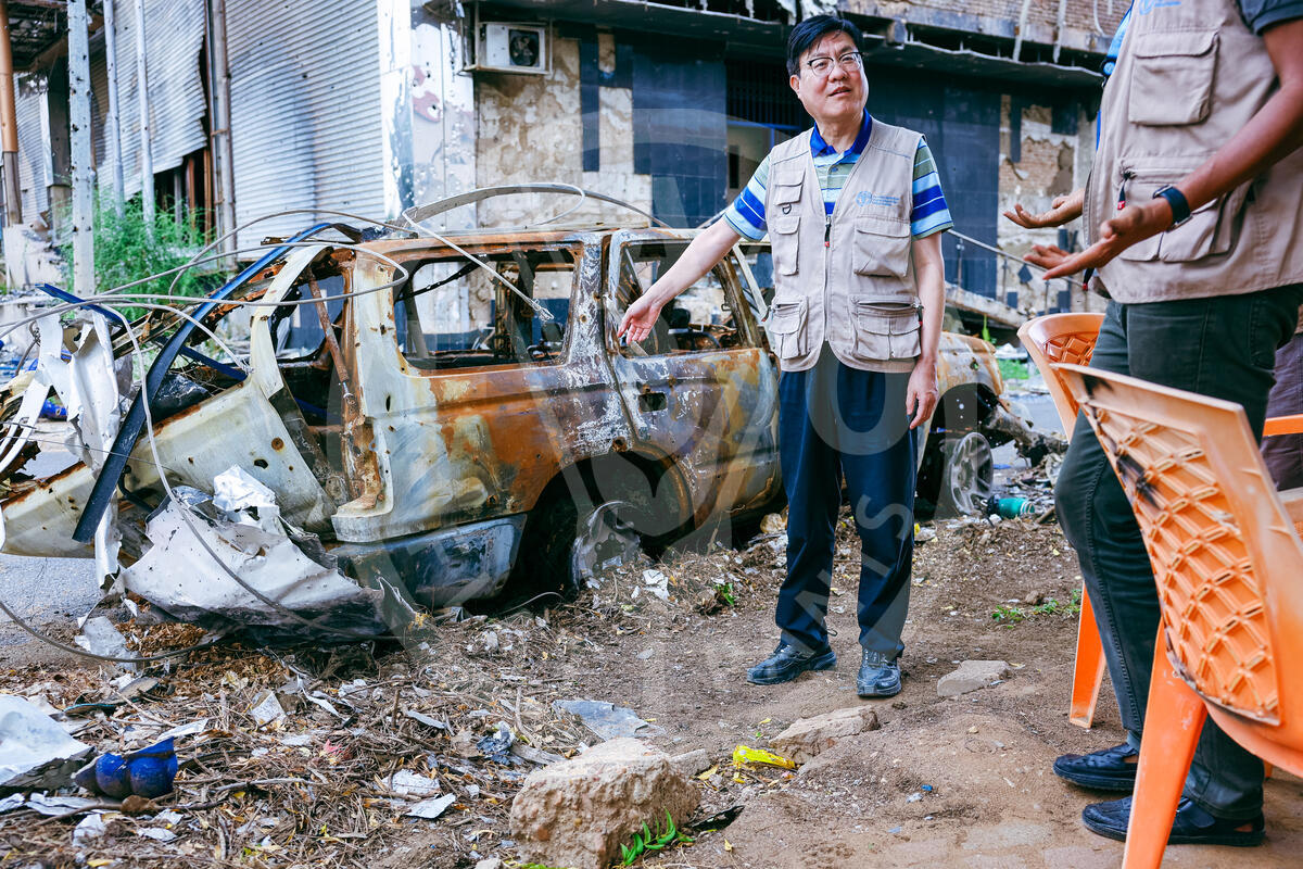 24 Aug 2025. Othman Digna Avenue, Khartoum, Sudan. Hongjie Yang, FAO Representative in Sudan stands by the wreckage of a car destroyed by the conflict.