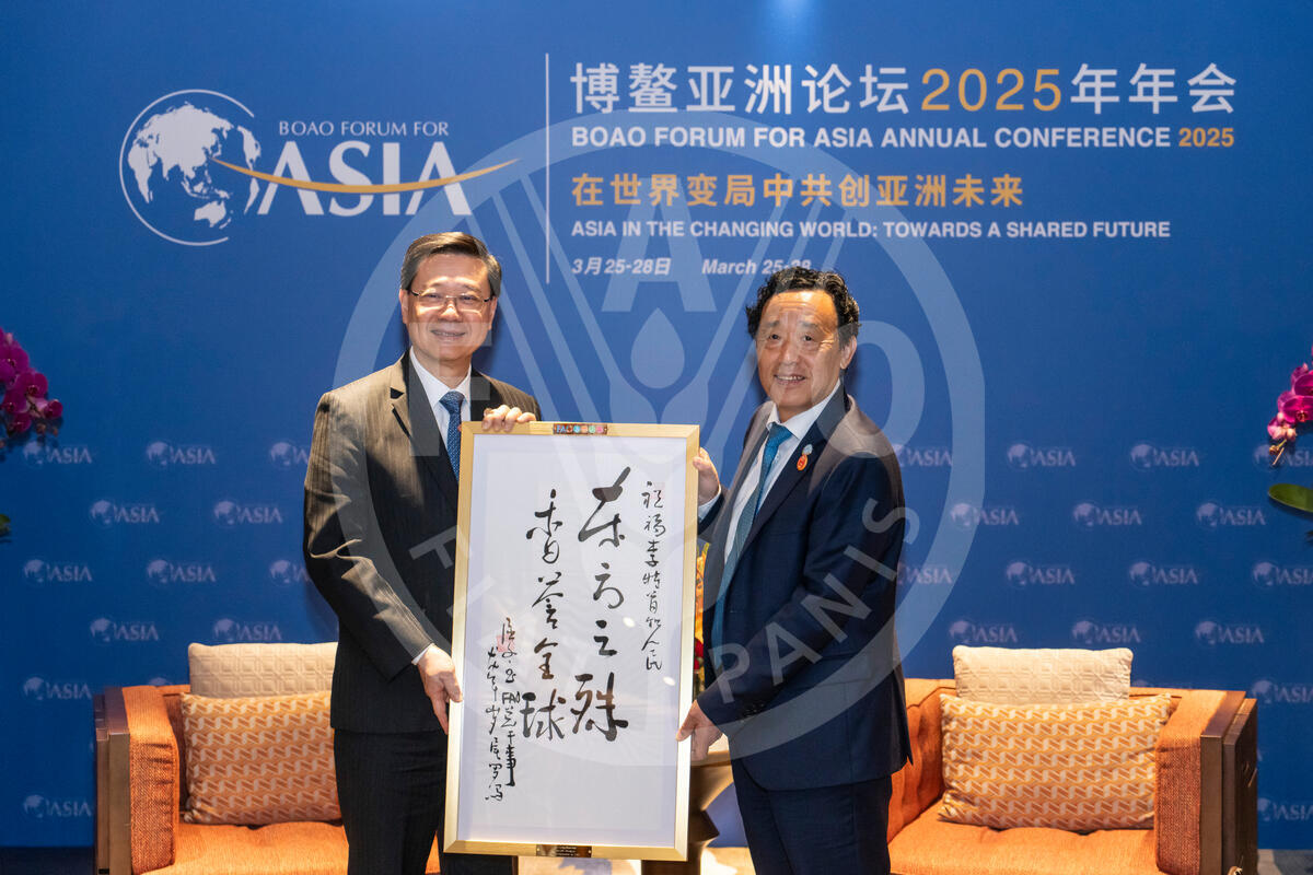 27 March 2026. Bo’ao, China. FAO Director-General QU Dongyu presents a gift of calligraphy to Chief Executive of Hong Kong SAR LEE Ka-chiu after a bilateral meeting at the Bo’ao Forum for Aisa 2025.