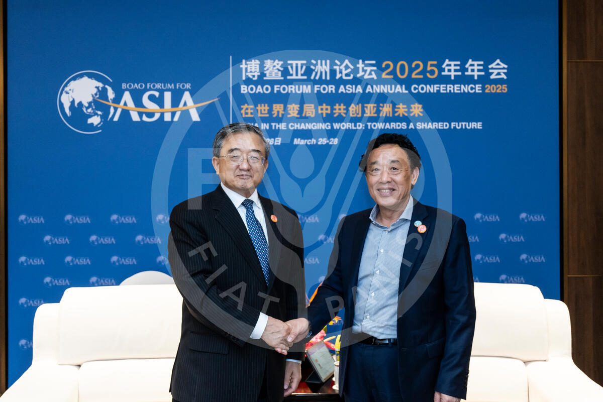 26 March 2026, Bo’ao, China. FAO Director-General QU Dongyu (R) shakes hands with China Special Envoy on Climate Change LIU Zhenmin during a bilateral meeting at the Bo’ao Forum for Asia 2025