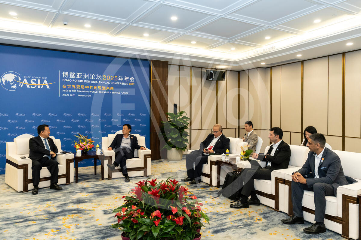26 March 2026, Bo’ao, China. FAO Director-General QU Dongyu speaks with Vice Chairman of China International Development Cooperation Agency ZHAO Fengtao during a bilateral meeting at the Bo’ao Forum for Asia 2025