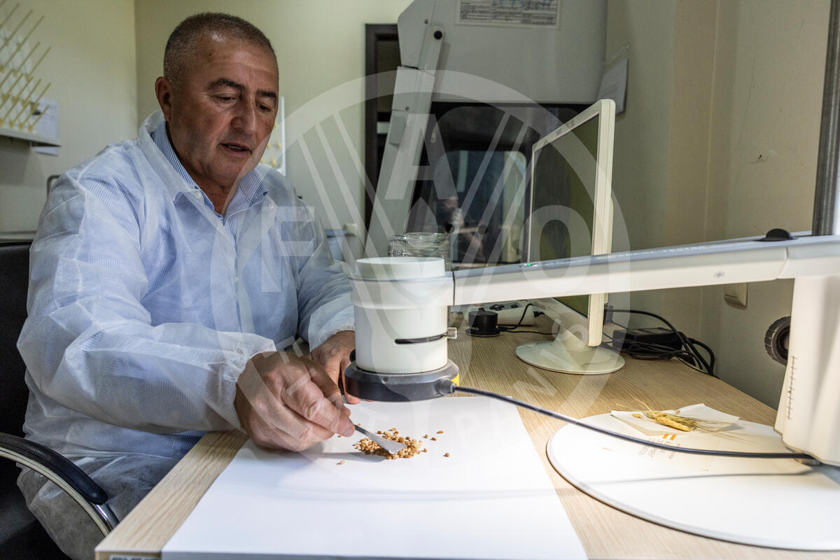May 2025, Tsilkani, Georgia — Scientific-Research Center of Agriculture director Levan Ujmajuridze looks at maize under the microscope to check the purity of the variety as part of the SRCA’ws work on the conservation and sustainable use of plant genetic resources for food in Tsilkani, Georgia.