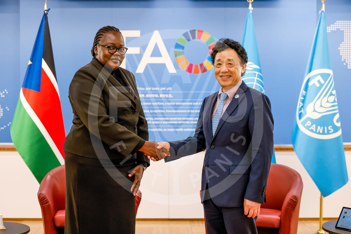 04 July 2025. Rome, Italy. FAO Director-General QU Dongyu meets South Sudan Deputy Minister for Agriculture and Food Security, Lily Albino Akol Akol. FAO headquarters, (Iraq room).