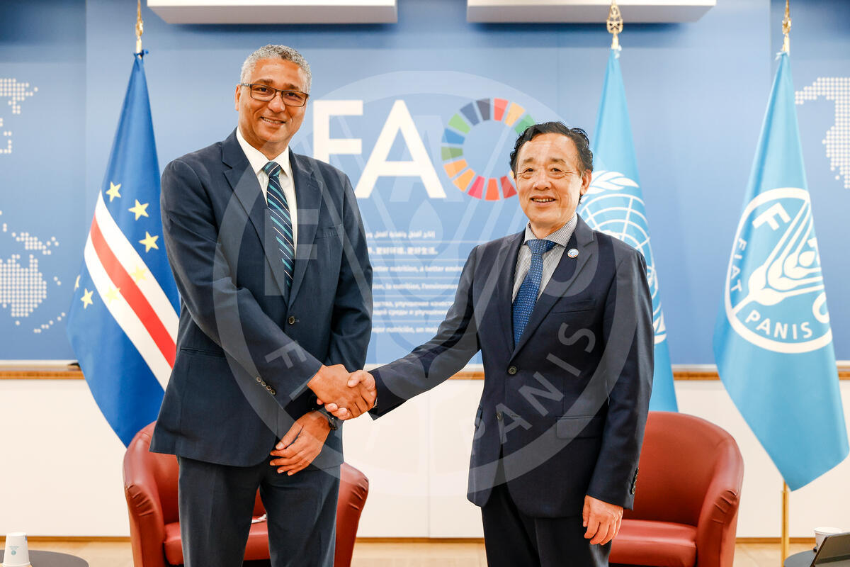 03 July 2025. Rome, Italy. FAO Director-General QU Dongyu meets Cabo Verde Minister for Agriculture and Environment, Gilberto Correia Carvalho Silva. FAO headquarters, (Iraq room).