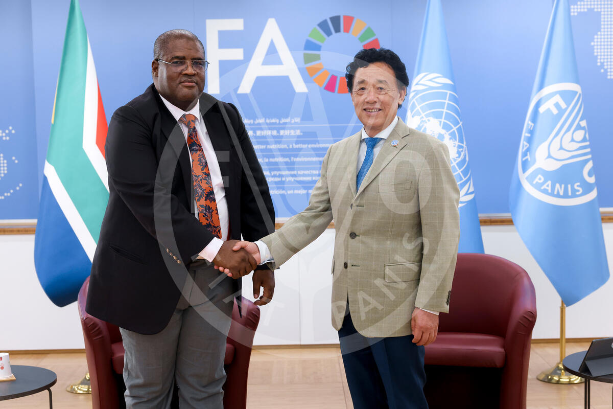 02 July 2025, Rome, Italy. FAO Director-General QU Dongyu meets South Africa Minister for Land Reform and Rural Development Mzwanele Nyhontso. FAO Headquarters (iraq Room).