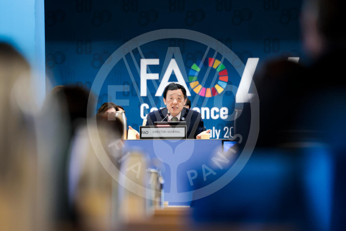 04 July 2025. Rome, Italy. FAO Director-General QU Dongyu delivers his address at the closing of the FAO conference 44th Session. FAO headquarters (Plenary Hall).