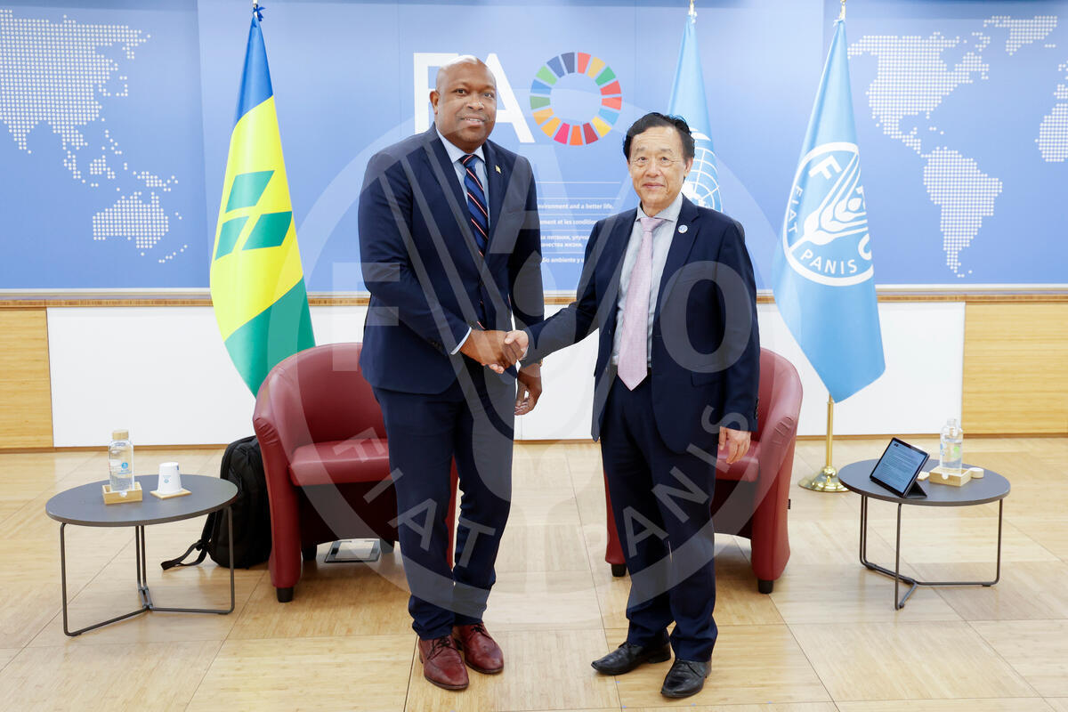 03 July 2025. Rome, Italy. FAO Director-General QU Dongyu meets Saint Vincent & the Grenadines Minister for Agriculture, Forestry, Fisheries and Rural Transformation, Industry & Labour, Saboto Caesar. FAO headquarters, (Iraq room).