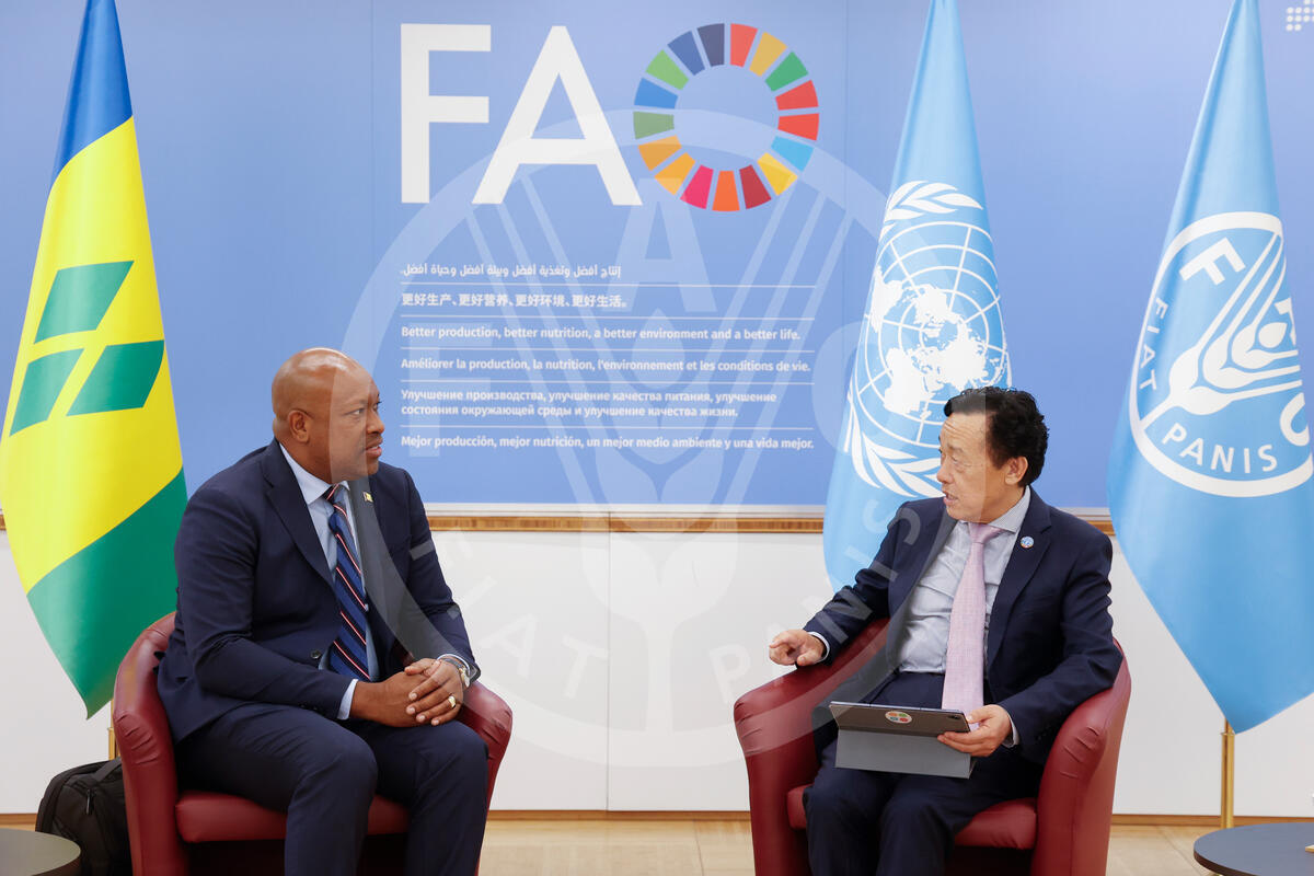 03 July 2025. Rome, Italy. FAO Director-General QU Dongyu meets Saint Vincent & the Grenadines Minister for Agriculture, Forestry, Fisheries and Rural Transformation, Industry & Labour, Saboto Caesar. FAO headquarters, (Iraq room).
