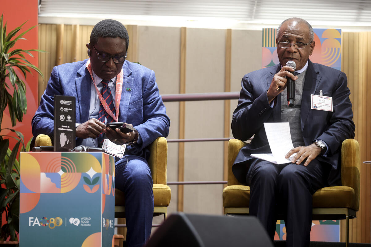 15 October 2025. FAO Headquarters, Rome, Italy. H.E. Isaac Francisco dos Anjos (R), Representative of the Republic of Angola, during the session “Regional Initiative for Southern Africa: Accelerating Climate-Smart Investments and Trade Integration in Southern Africa’s Agrifood Systems.” Hand-in-Hand (HIH) Initiative Investment Forum 2025, World Food Forum (WFF) 2025.