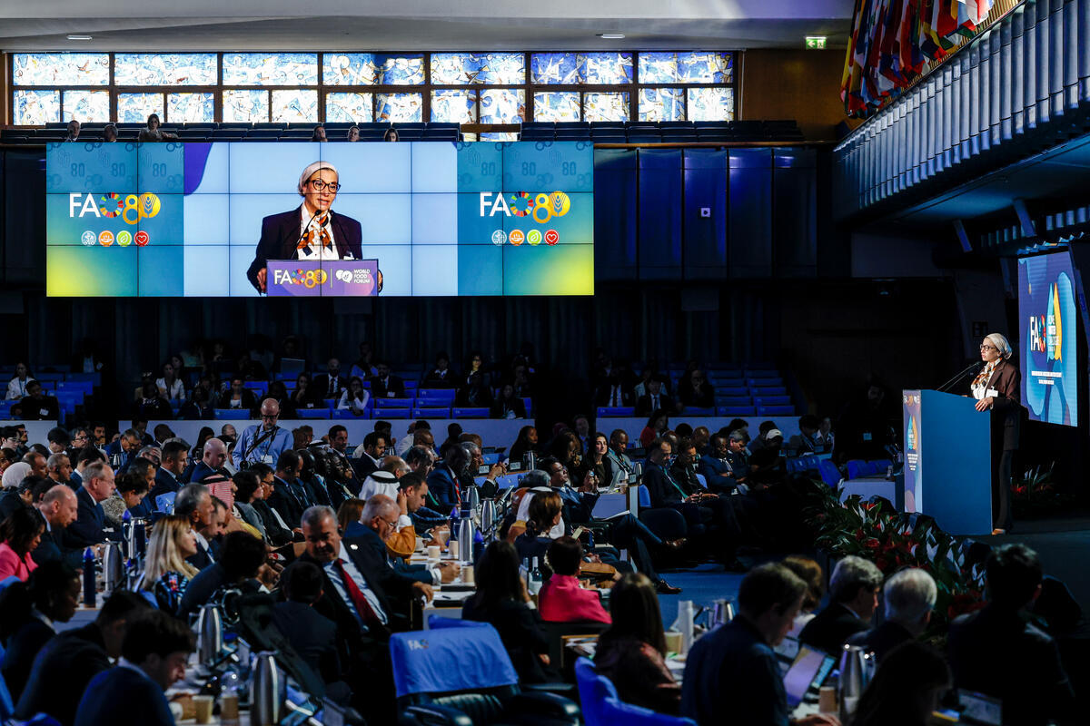 15 October 2025, Rome, Italy. Yasmine Fouad, Under-Secretary-General and Executive Secretary, United Nations Convention to Combat Desertification (UNCCD) speaks at the opening ceremony of the Rome Water Dialogue: High-Level Segment. The fifth edition of the World Food Forum (WFF), the largest annual gathering of agrifood systems stakeholders globally, runs at FAO headquarters in Rome from 10 to 17 October 2025. FAO Headquarters (Plenary Hall).