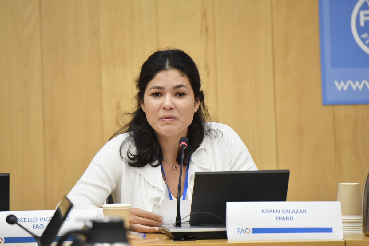 15 October 2025. FAO Headquarters, Rome, Italy. Food security and Nutrition Specialist Karen Salazar Ledezma speaks at the session “Voices for Change: Youth-Led Governance for Urban Agrifood System Transformation”, World Food Forum, 2025.