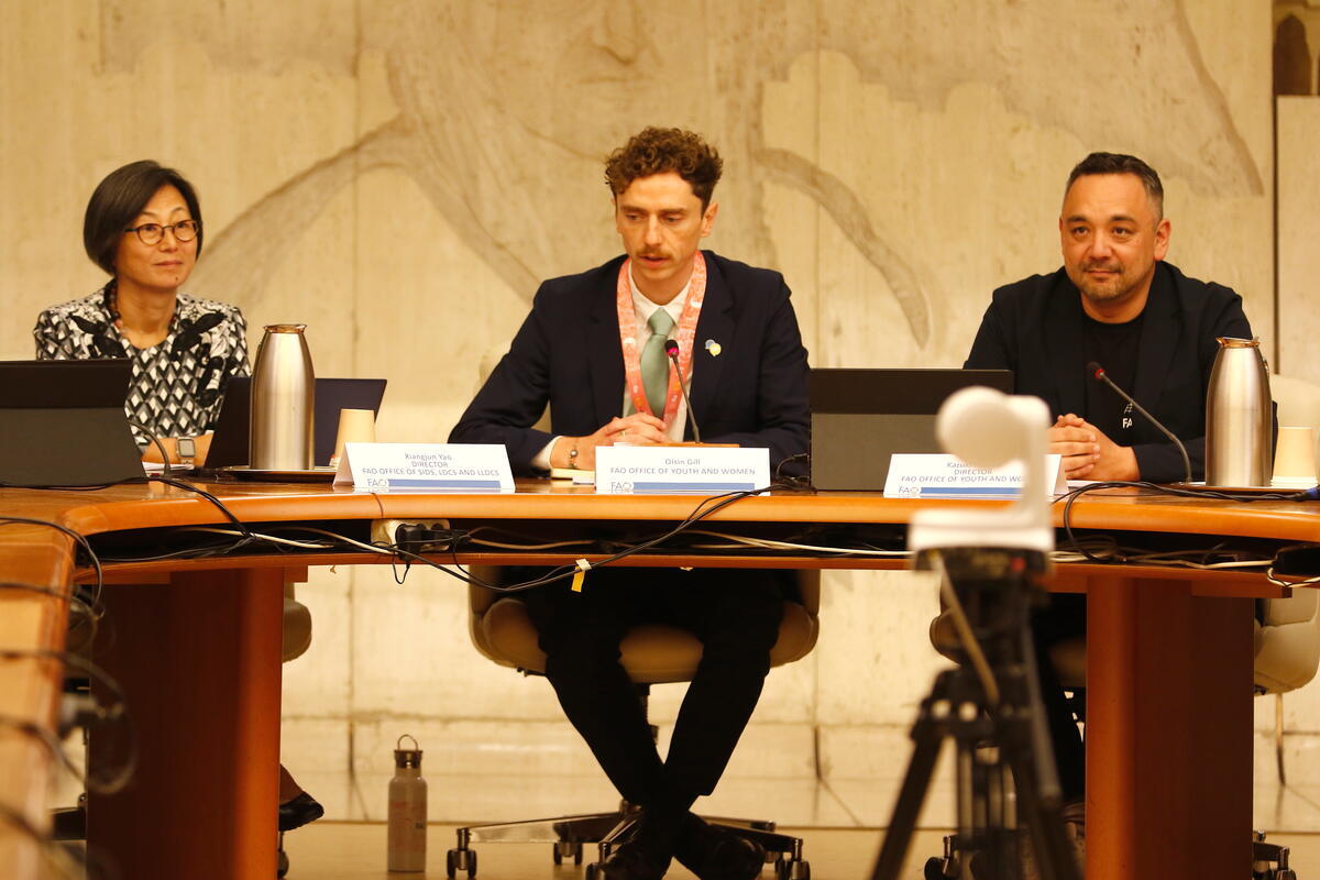 15 October 2025. FAO Headquarters, Rome, Italy. Mr. Kazuki Kitaoka (R), Director, Office of Youth and Women, FAO; Mr. OisÃn Gill (C), Office of Youth and Women, FAO; and Ms. Xiangjun Yao (L), Director, Office of Small Island Developing States (SIDS), Least Developed Countries (LDCs) and Landlocked Developing Countries (LLDCs), FAO, attend the session dedicated to the global launch of the Global Teach Ag Network Community during the World Food Forum (WFF) 2025.