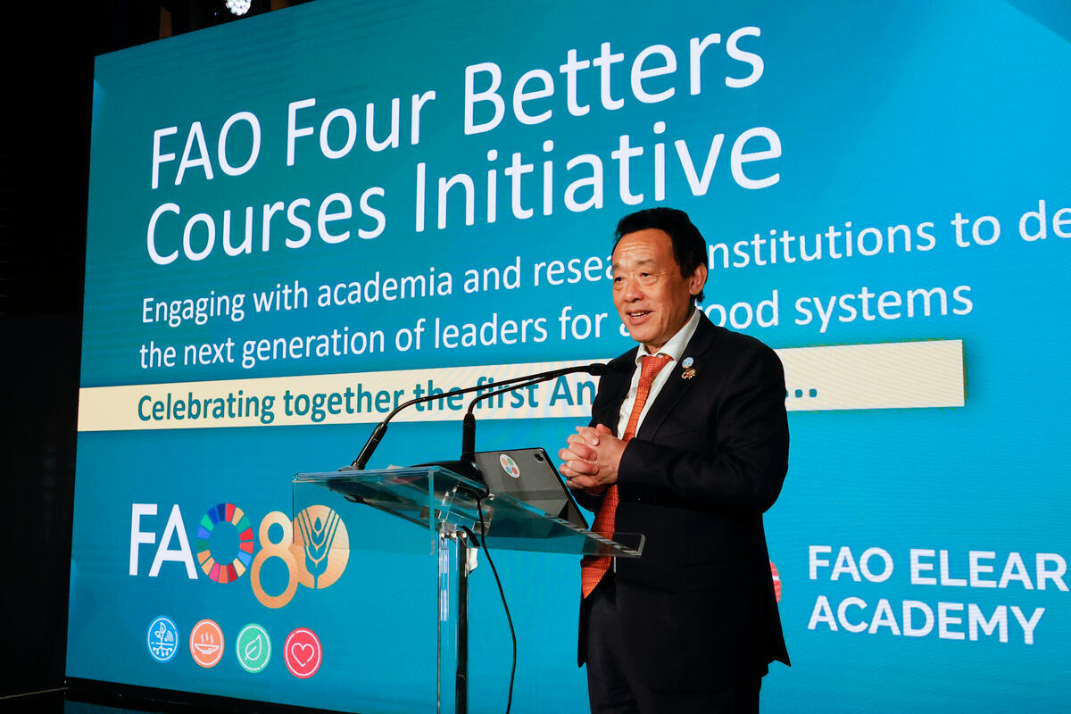 15 October 2025, Rome, Italy. FAO Director-General QU Dongyu speaks at the "FAO 4 Betters Courses initiative Empowering Universities and Research Centers worldwide". World Food Forum (WFF) 2025. The fifth edition of the World Food Forum (WFF), the largest annual gathering of agrifood systems stakeholders globally, runs at FAO headquarters in Rome from 10 to 17 October 2025. FAO Headquarters (Sheikh Zayed Centre).