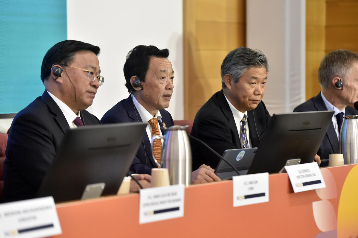 15 October 2025. FAO Headquarters, Rome, Italy. Jun Han (L), Minister of Agriculture and Rural Affairs of the People's Republic of China, QU Dongyu (M), FAO Director-General and H.E. Zhang Lubiao (R), Permanent Representative of the People's Republic of China to FAO at the session