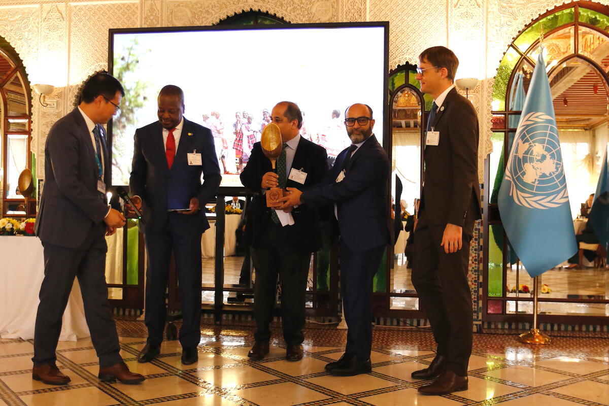 Lifeng Li (L), Director of Land and Water Division FAO, Chetan Kumar (C), Global Head of Forests and Grasslands Team IUCN, Jurgis Pierre-Louis Sapijanskas (R) Biodiversity Coordinator, Global Environment Facility GEF during the Awarding UN Decade on Ecosystem Restoration World Restoration Flagships Ceremony.