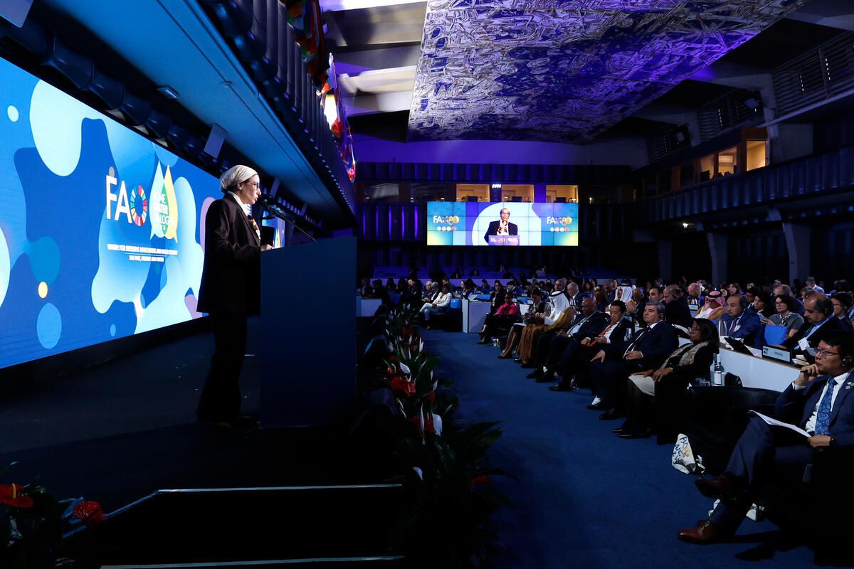 15 October 2025, Rome, Italy. Yasmine Fouad, Under-Secretary-General and Executive Secretary, United Nations Convention to Combat Desertification (UNCCD) delivers her address during the World Food Forum (WFF) 2025. The fifth edition of the World Food Forum (WFF), the largest annual gathering of agrifood systems stakeholders globally, runs at FAO headquarters in Rome from 10 to 17 October 2025. FAO Headquarters, (Plenary Hall).