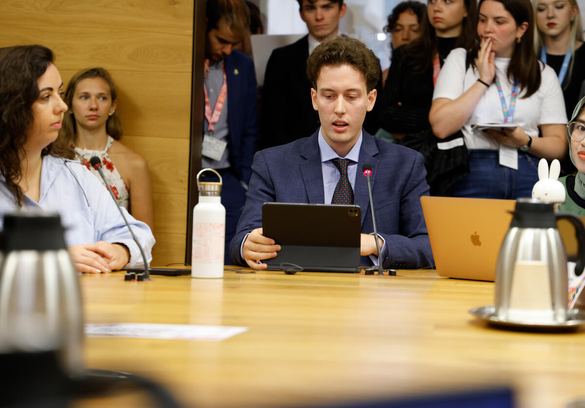 15 October 2025. FAO Headquarters, Rome, Italy. Pierpaolo Brogelli, Academic Delegate from LUISS, speaks at the Europe and Central Asia Roundtable of the Youth Assembly during the World Food Forum 2025.